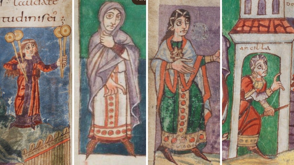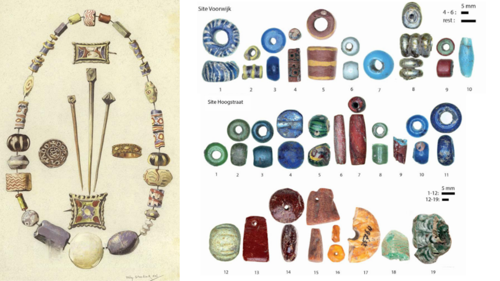 Vrouwen droegen doorgaans een linnen onderjurk met daarover een wollen overjurk. In manuscriptafbeeldingen zien we vaak korte mouwen en karakteristieke Frankische decoratie langs de boorden (zie figuur 1). De kleding werd gecombineerd met een riem of band en keerschoenen. Afhankelijk van status konden sieraden worden gedragen, zoals glazen kralen (fig. 2), oorbellen of fibulae. Daarnaast waren een mantel, haarpinnen (van metaal, been of hout) en een sluier of hoofddoek gebruikelijk. Deze hoofdbedekking kon vervaardigd zijn van linnen, wol of – in uitzonderlijke gevallen – zijde, en werd vastgezet met spelden of banden. Een mes met houten handvat maakte eveneens deel uit van de uitrusting.